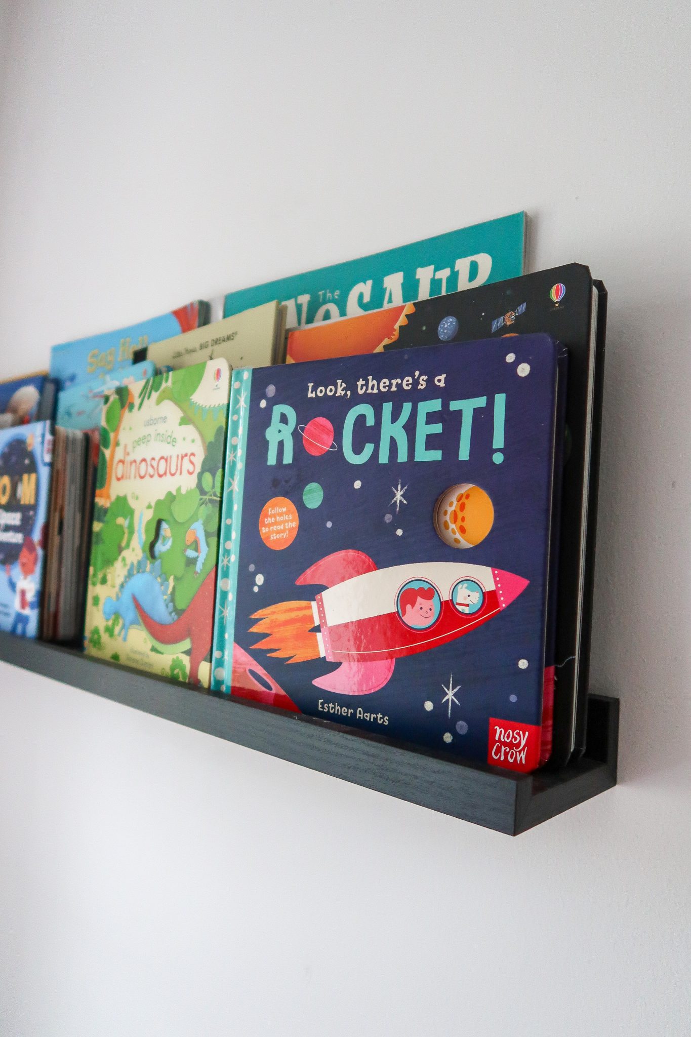 His room is small, so we needed to be creative with the space. As I said, I wanted it to feel cosy, but definitely didn’t want it to feel cramped as a result. Dan built him a cabin bed which means he has a lot more floor space than he did previously. He also built him an open wardrobe (pictures coming soon), which makes the room seem a lot less cramped than it would with a traditional, full size wardrobe. Then it was a case of making the most of the walls – a shelf for books above his bed, rather than a bookcase on the floor, and we also created a wall shelving unit in the style of an old crate which works really nicely with the room.